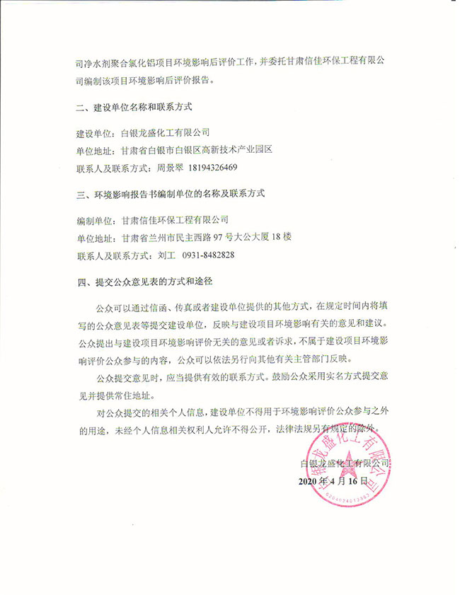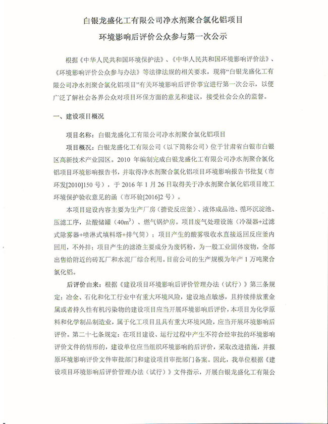 白銀龍盛化工有限公司凈水劑聚合氯化鋁項(xiàng)目環(huán)境影響后評(píng)價(jià)公眾參與第一次公示